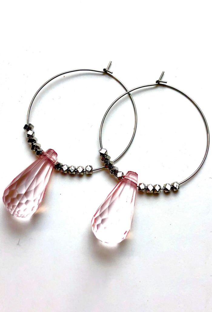 The Pink Faceted Briolette on Gun Metal Hoop showcases an elegant design with a unique color combination. Featuring a delicate pink briolette stone, it contrasts beautifully with the dark gun metal hoop for a versatile style. Perfect for both casual and formal occasions, this piece offers timeless charm and sophistication.