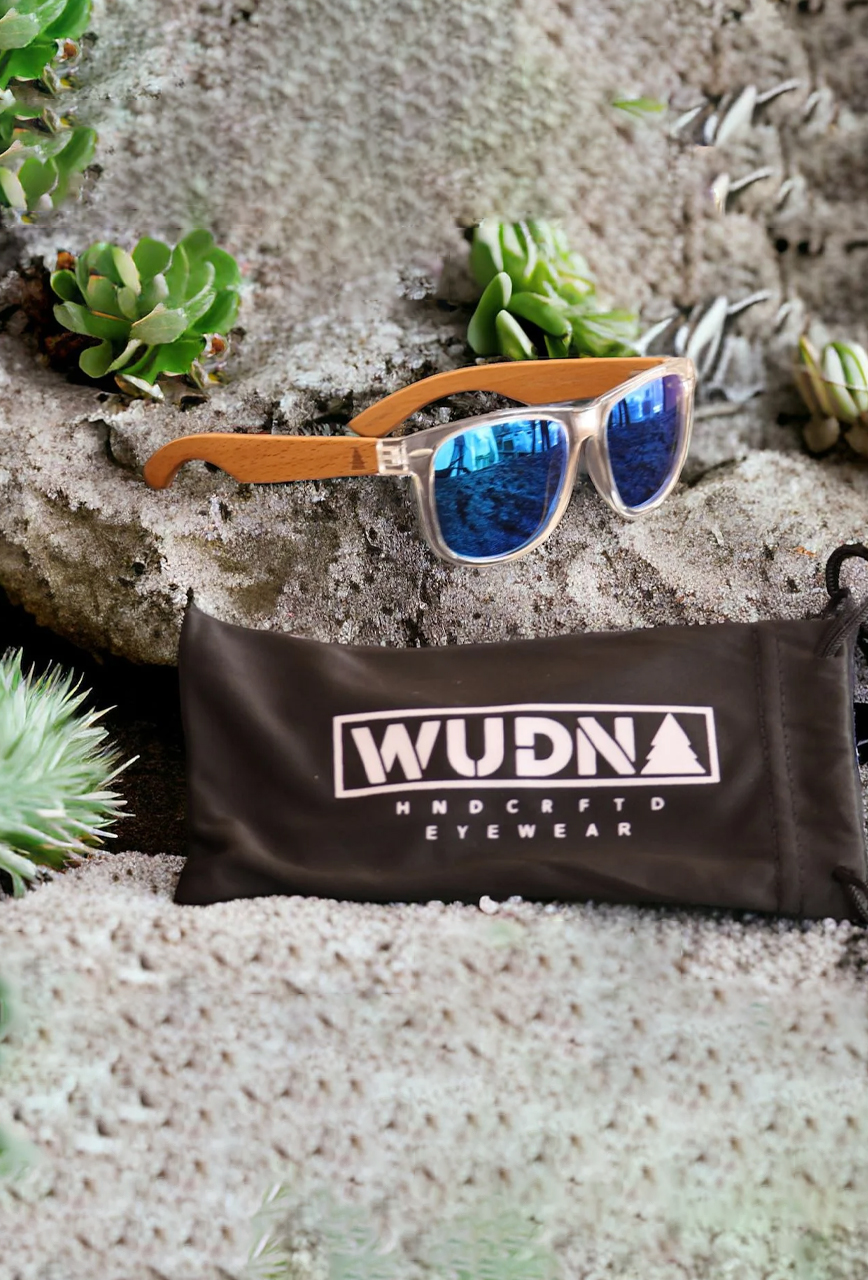 Organic blue polarized lenses sunglasses with wood accent handles.
