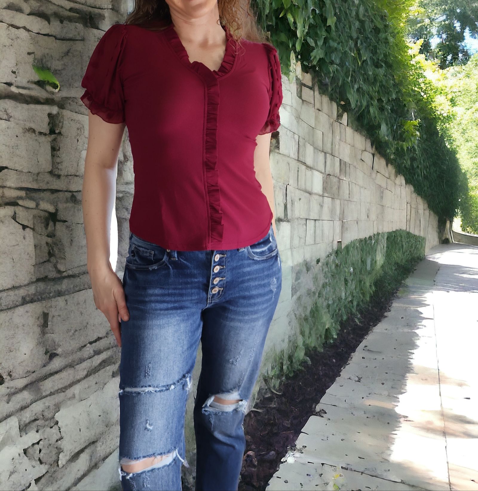 The Ruffle Surplus Puff Sleeve Woven Top in black features an elegant wrap-style design with a flattering V-neckline. Puff sleeves and subtle ruffle accents add a feminine touch to its structured silhouette. Crafted from lightweight woven fabric, this top offers versatility for both casual and formal settings. Pair it with tailored pants or denim for a polished, stylish look.