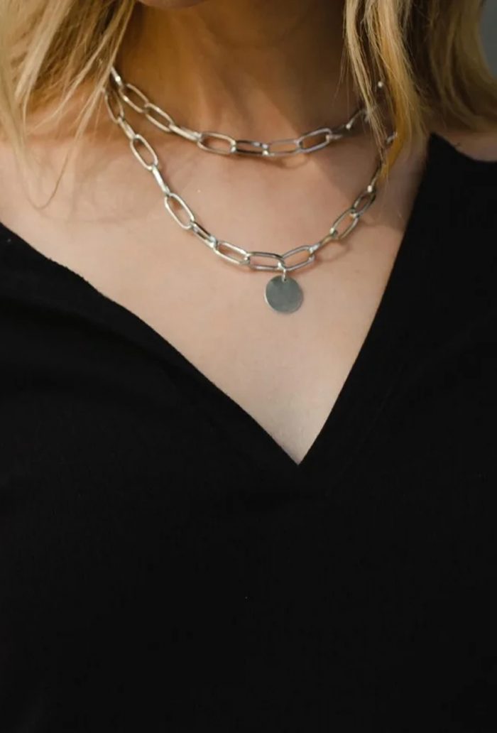The Silver Paperclip Necklace with Circle Charm features an elegant and minimalist design, perfect for everyday wear or special occasions. Crafted with a dainty silver chain and a sleek circle charm, it offers a modern yet timeless style. This versatile accessory pairs effortlessly with various outfits, adding a touch of sophistication to any look.