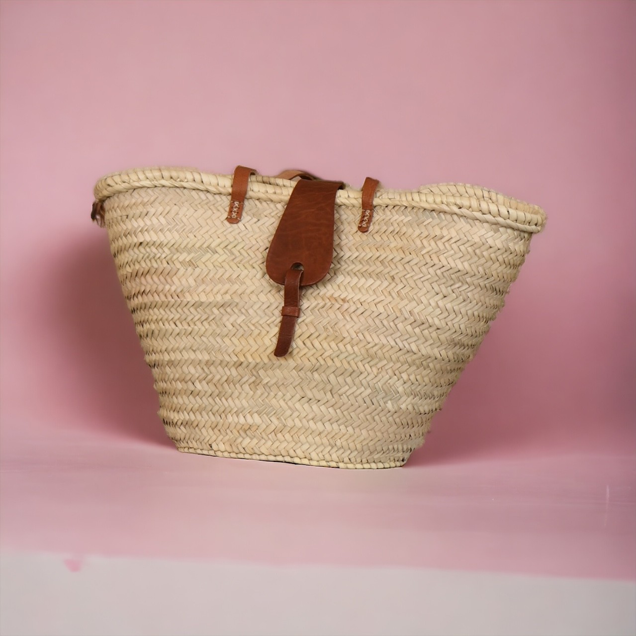 Straw Basket – Handmade with Leather Long Handle Buckle