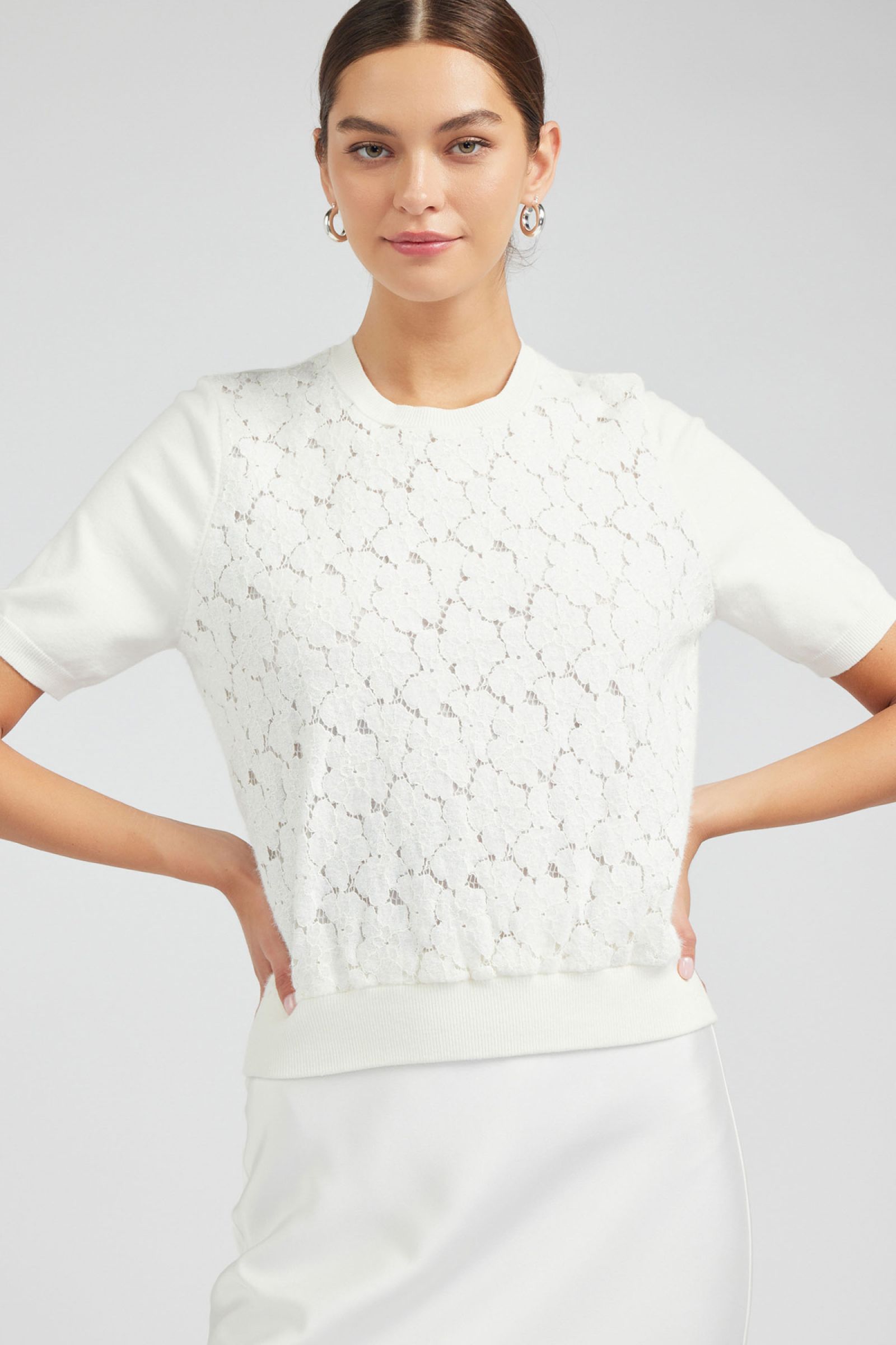 CONTRAST SHORT SLEEVE ROUND NECK LACE SWEATER
